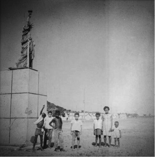 Crianças posam ao lado de réplica da Estátua da Liberdade na Vila Kennedy